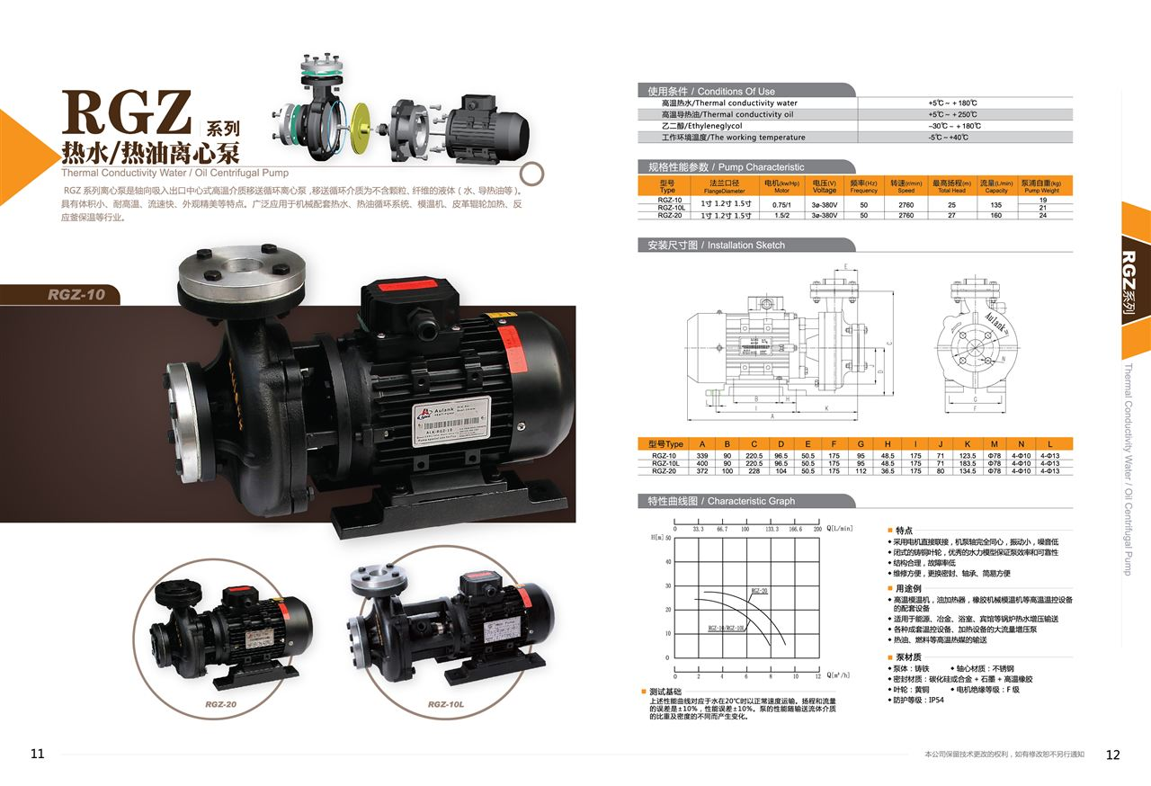 公司产品包括:RGP系列大流量耐高温离心泵、RGZ系列高流速耐高温离心泵、WM系列标准型耐温高旋涡泵、WD系列精致型高扬程耐高温漩涡泵、ISW系列冷水循环泵、WRY系列联轴式高温泵。其中,WM系列、WD系列和WF系列热水泵耐温120℃~150℃,热油泵耐温100℃~200℃;RGP系列和RGZ系列的热水泵耐温120℃~180℃、热油泵耐温200℃~250℃;WRY系列联轴泵zui高耐温350℃。