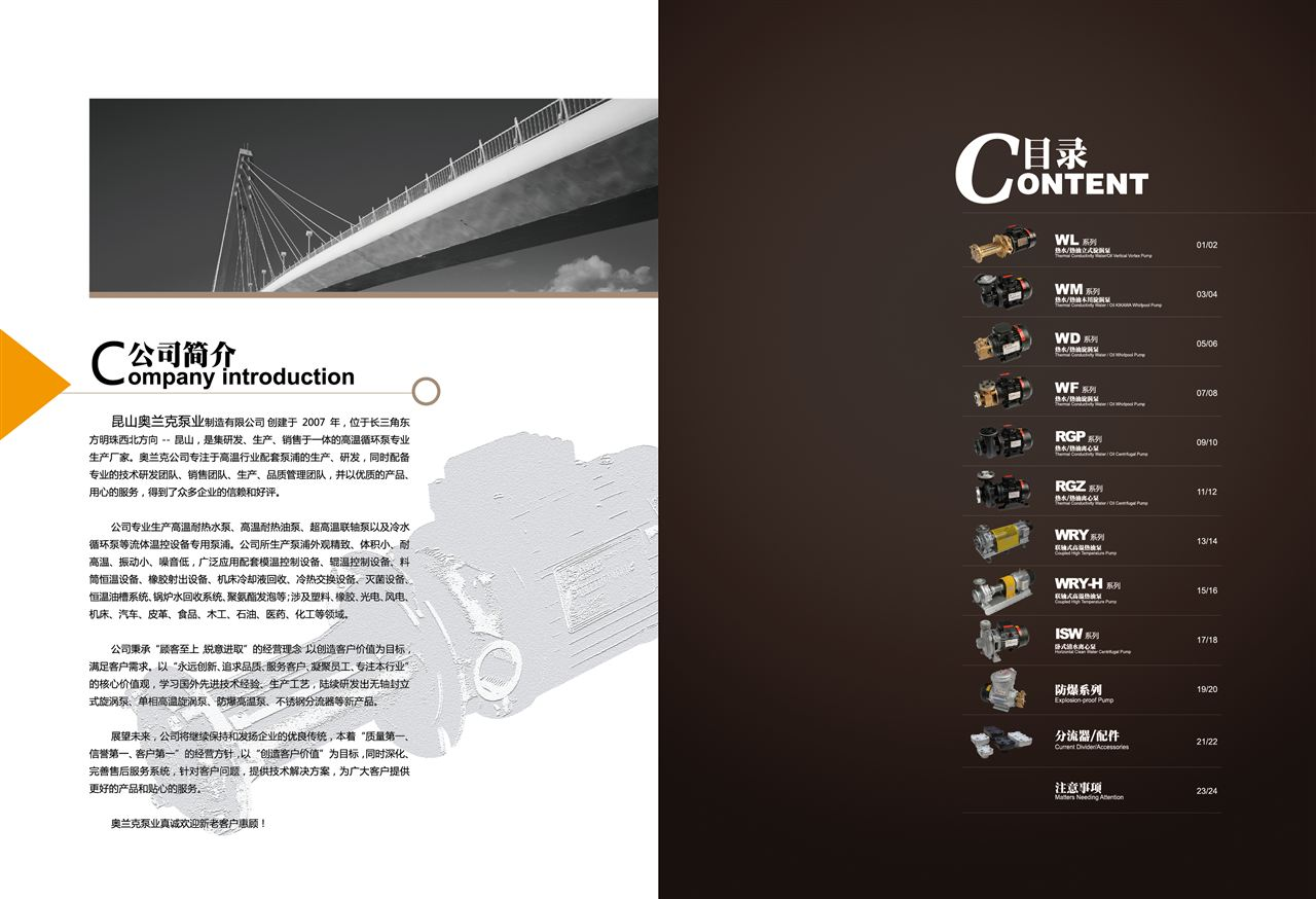 公司产品包括:RGP系列大流量耐高温离心泵、RGZ系列高流速耐高温离心泵、WM系列标准型耐温高旋涡泵、WD系列精致型高扬程耐高温漩涡泵、ISW系列冷水循环泵、WRY系列联轴式高温泵。其中,WM系列、WD系列和WF系列热水泵耐温120℃~150℃,热油泵耐温100℃~200℃;RGP系列和RGZ系列的热水泵耐温120℃~180℃、热油泵耐温200℃~250℃;WRY系列联轴泵zui高耐温350℃。